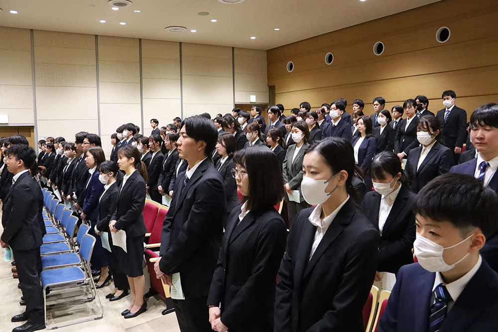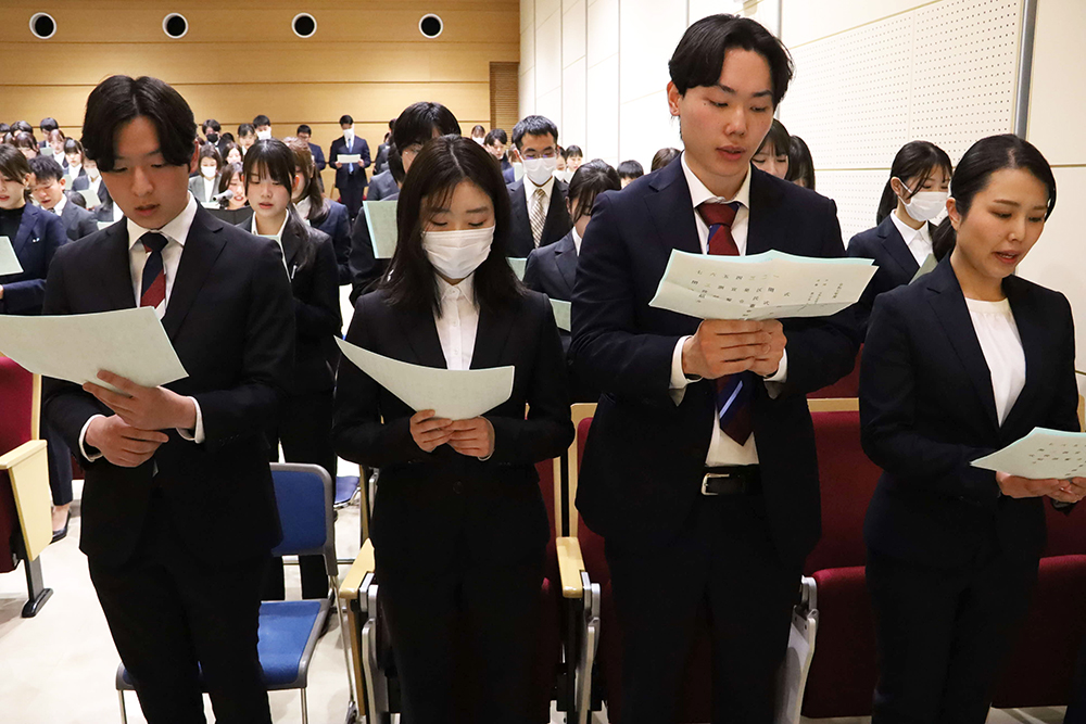 今年度の新規採用職員は226人。代表者による区民憲章の朗読後、発令では新規採用職員一人ひとりの名前が読み上げられ発令。続いて新規採用職員の代表者が宣誓を行い、森澤区長は訓話の中で新規採用職員を激励しました。式を終えた新規採用職員は、研修や人事制度の説明を受けた後、それぞれ配属された職場へ移動し、辞令が交付されました。