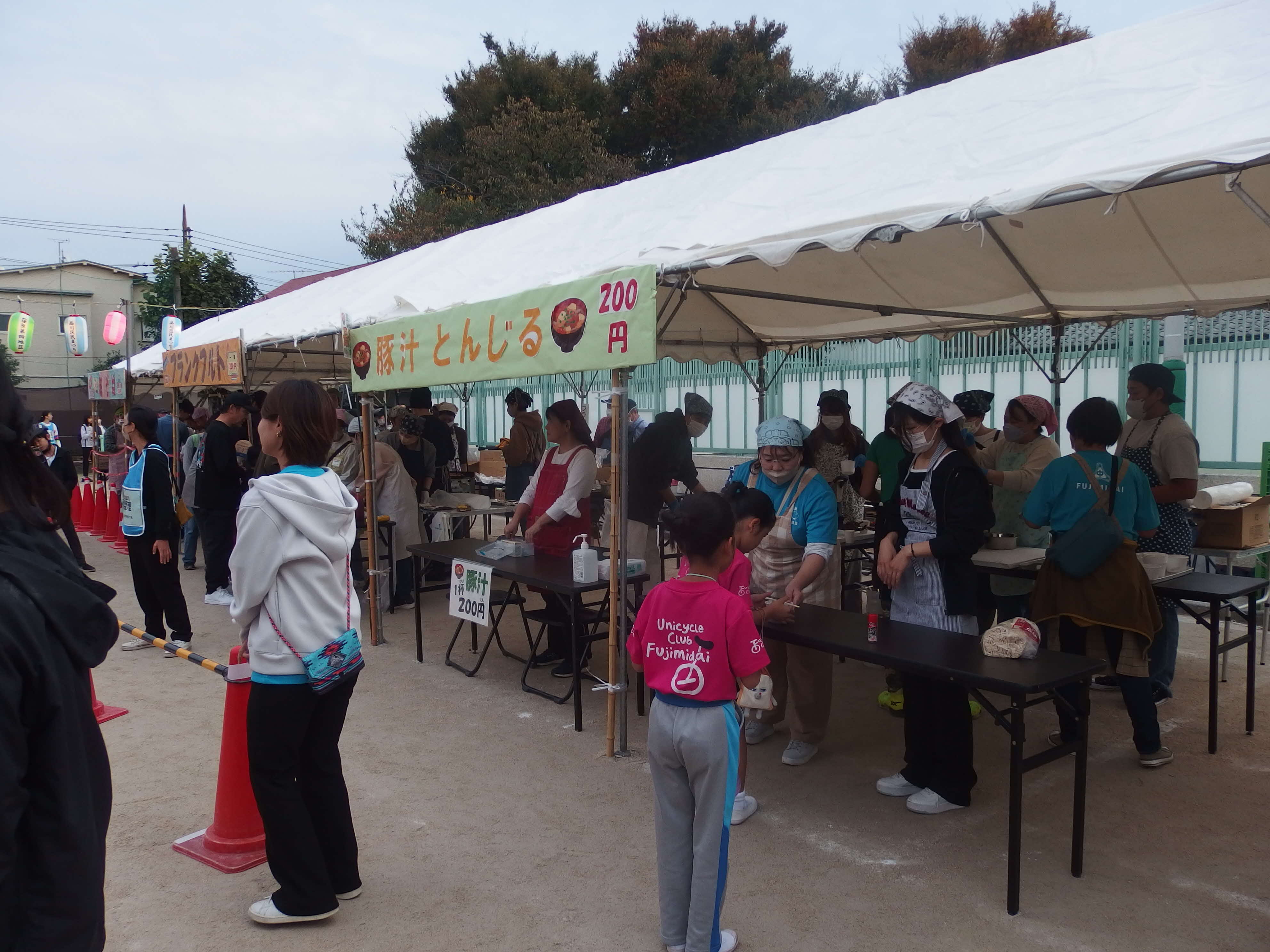 模擬店では、ジュース、ベビーカステラ、ヨーヨーつり、豚汁、焼きそば、フランクフルトが出店され、どれも大盛の来場者で賑わっていました。