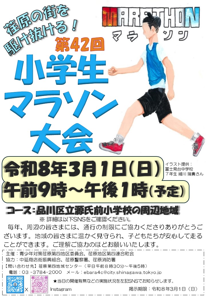 トップページ > 施設案内 > 区役所・地域センター > 地域センターからのお知らせ > 荏原第四地域センター > 荏原第四地域センターからのお知らせ > 第42回小学生マラソン大会開催のお知らせ