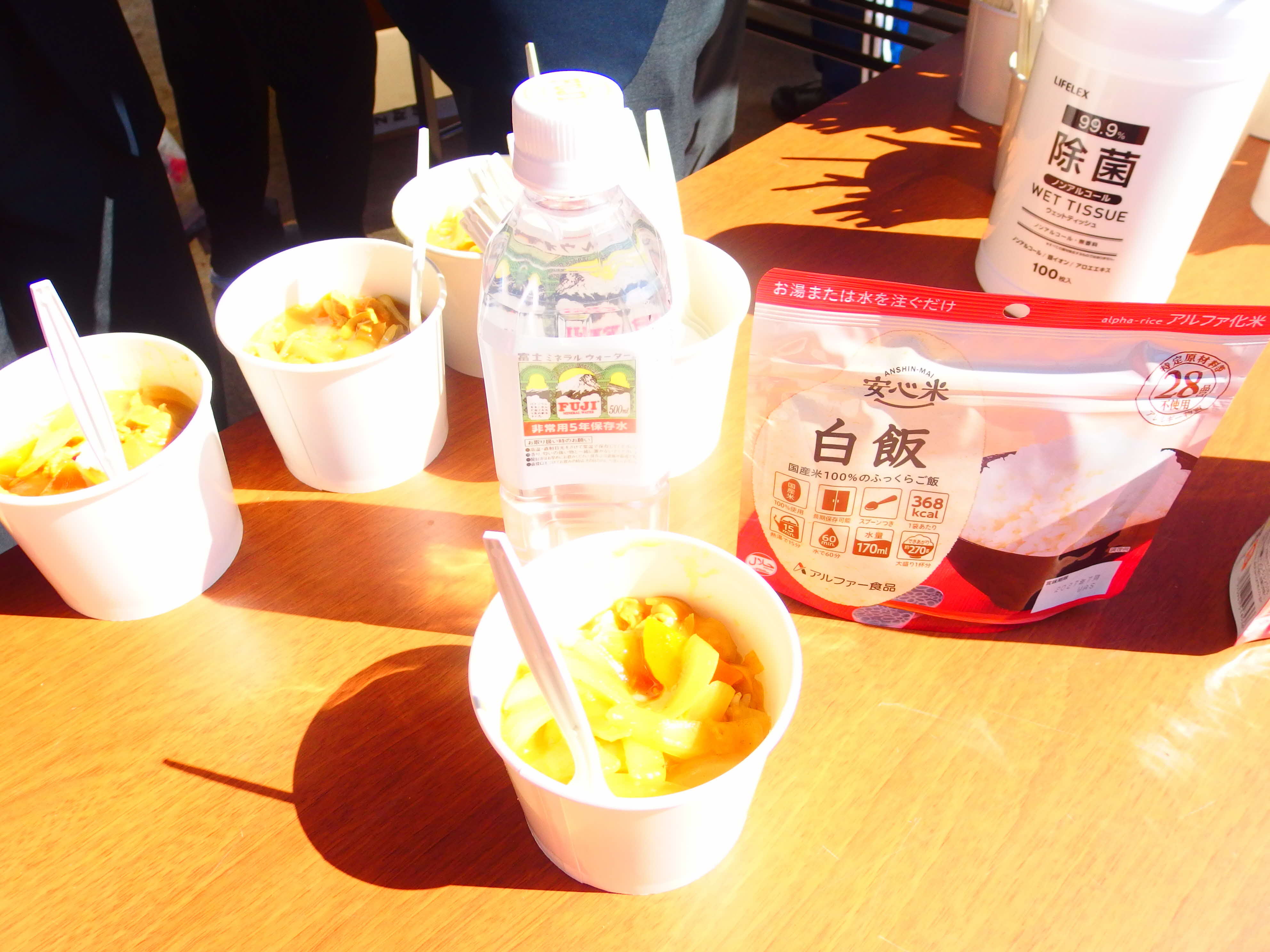 参加者には、防災リュック間違い探し、消火器射的、防災借り物競争、がれき転がし、防災トイレ・煙体験の5つのブースをスタンプラリー形式でまわってもらい、体験を通して防災について学び、防災知識を高めてもらいました。体験後には、荏原町商店街振興組合による食品ブースで、甘酒とアルファ化米のカレーライスを提供し、災害用のアルファ化米を実際に試食いただきました。
