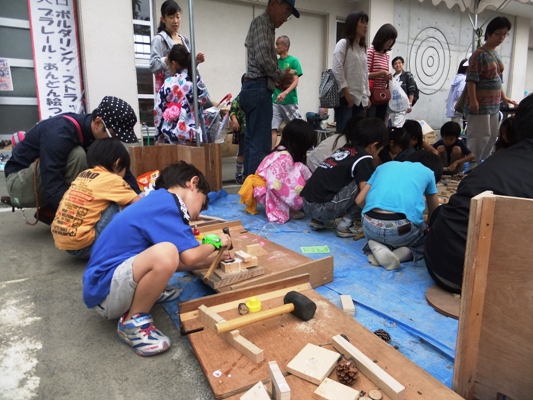 木材を自由に使って造形遊びができる「木工体験コーナー」は子どもたちに大人気。地区委員の皆さんの運営です。