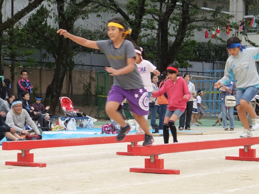 タイヤくぐり、ピンポン玉運び、平均台、シートくぐりの後、女子はなわとび、男子は袋でジャンプ!