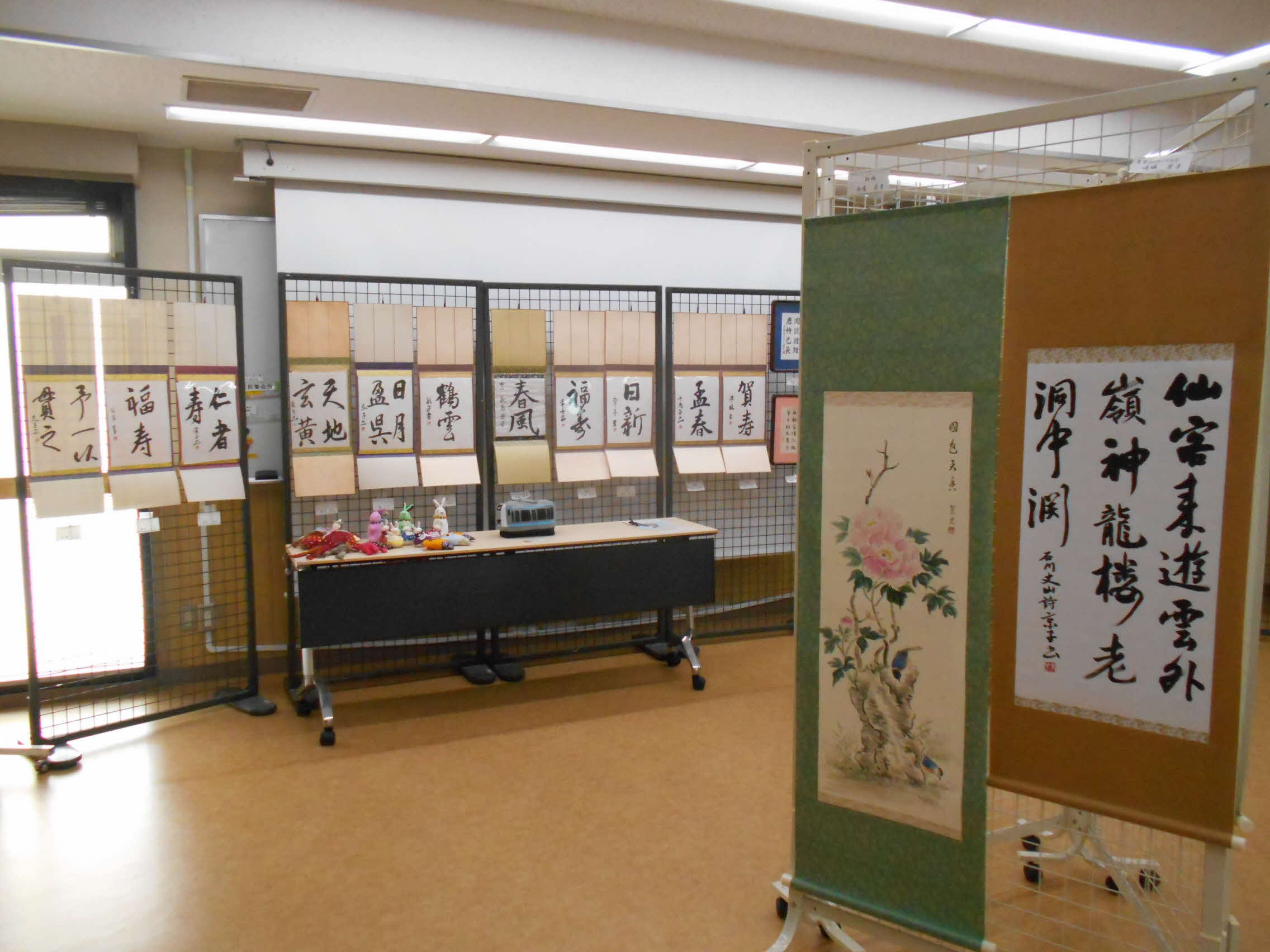 今年度も新型コロナウイルスの影響により、大井第二地域センター(2階)を会場に作品展示と手作り講習会のみの実施となりました。展示された作品は110点ほどで、手工芸、絵画、書道、写真、生け花などの力作が並びました。