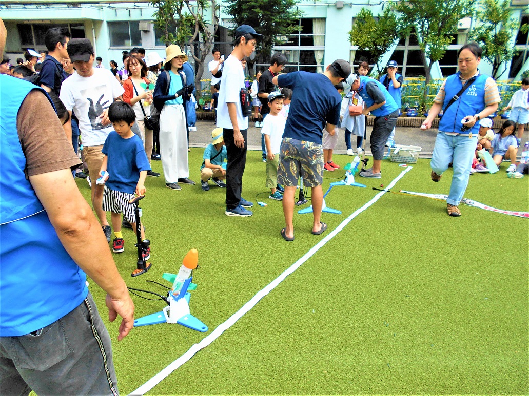 当日は事前に作ることのできなかった方が体育館で、ペットボトルを加工してロケットを作成しました。刃物を使うため慎重に、保護者の方も子どものために一生懸命に加工していました。出来上がったロケットには、子どもたちが色紙を張ったり絵を描いたり、思い思いにそれぞれ自分だけのロケットへ飾りつけていました。子どもたちは皆自分のロケットが飛ぶまで、ワクワク楽しそうな表情を浮かべて今か今かと自分の番を待っていました。実際にロケットを飛ばしてみると、大きな弧を描いて飛んでいくものもあれば、中々思うように飛ばなかったり様々でしたが、保護者も来場者も子どもたちも、みんなで一緒にロケットの行く先を追っていました。