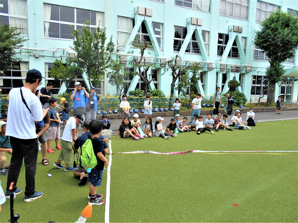 大井第一小学校を会場として、87組102名の1年生から6年生(3年生までは保護者同伴)が参加し、当日は恵まれた晴天の中、作り上げたロケットを飛ばしました。