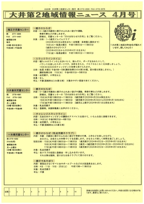 トップページ > 施設案内 > 区役所・地域センター > 地域センターからのお知らせ > 大井第二地域センター > 大井第二地域センターからのお知らせ > 「大井第2地域情報ニュース 2026年4月号」