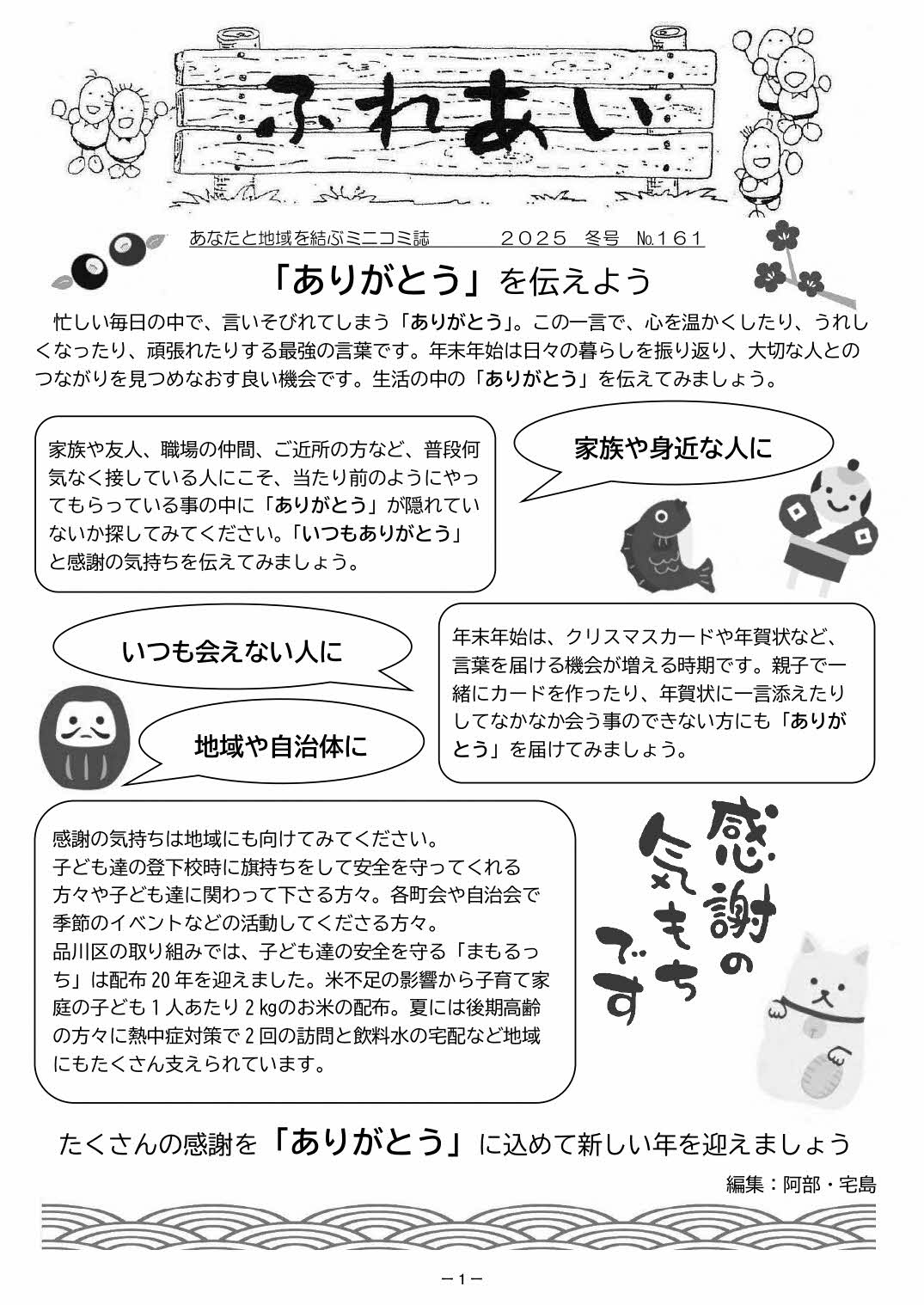 ふれあい161号を発行しました。「ありがとうを伝えよう」(1ページ)、「しながわクルーズ」(2、3ページ)、「しなみちレポート」(4、5ページ)、「鏡餅クイズ」(6、7ページ)、大崎第二地域センター所長所感(8ページ)となっています。