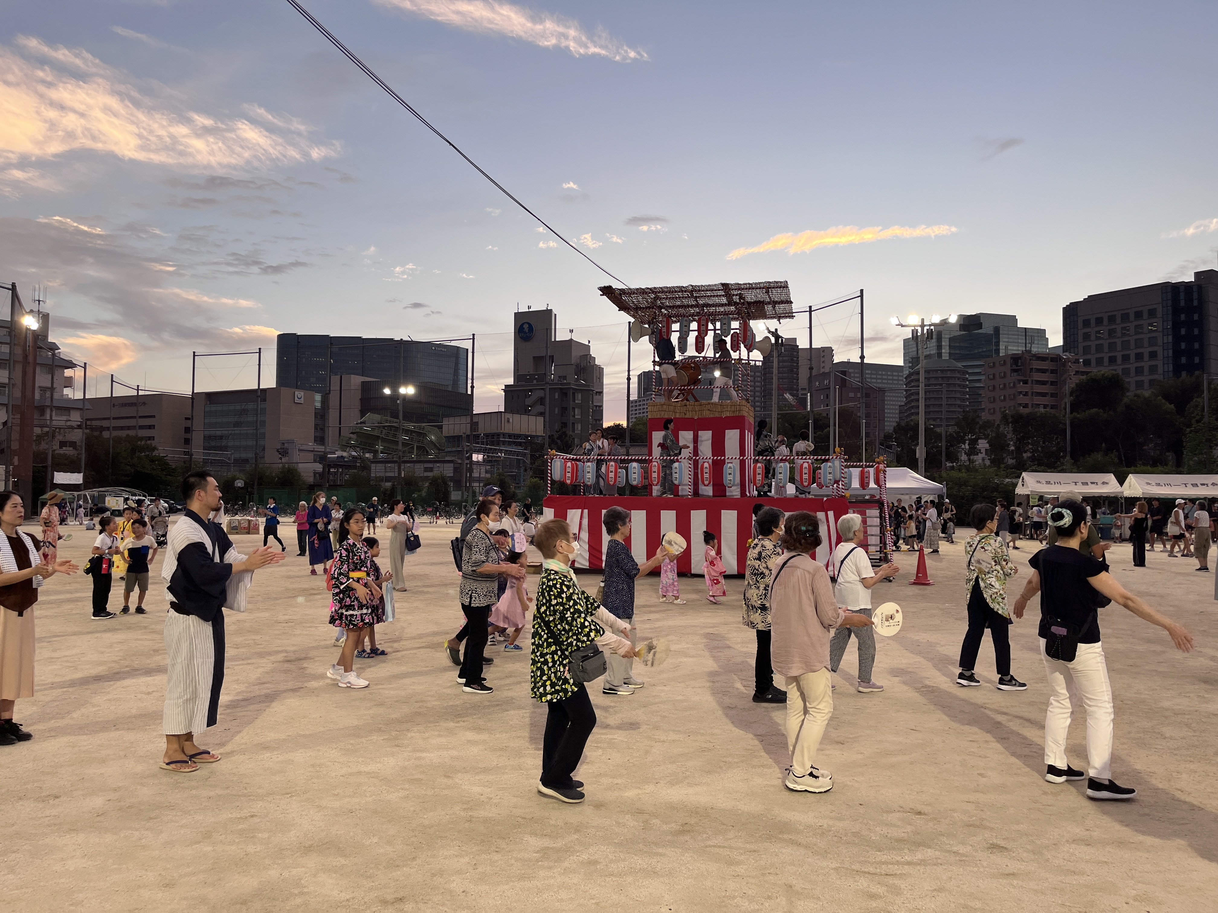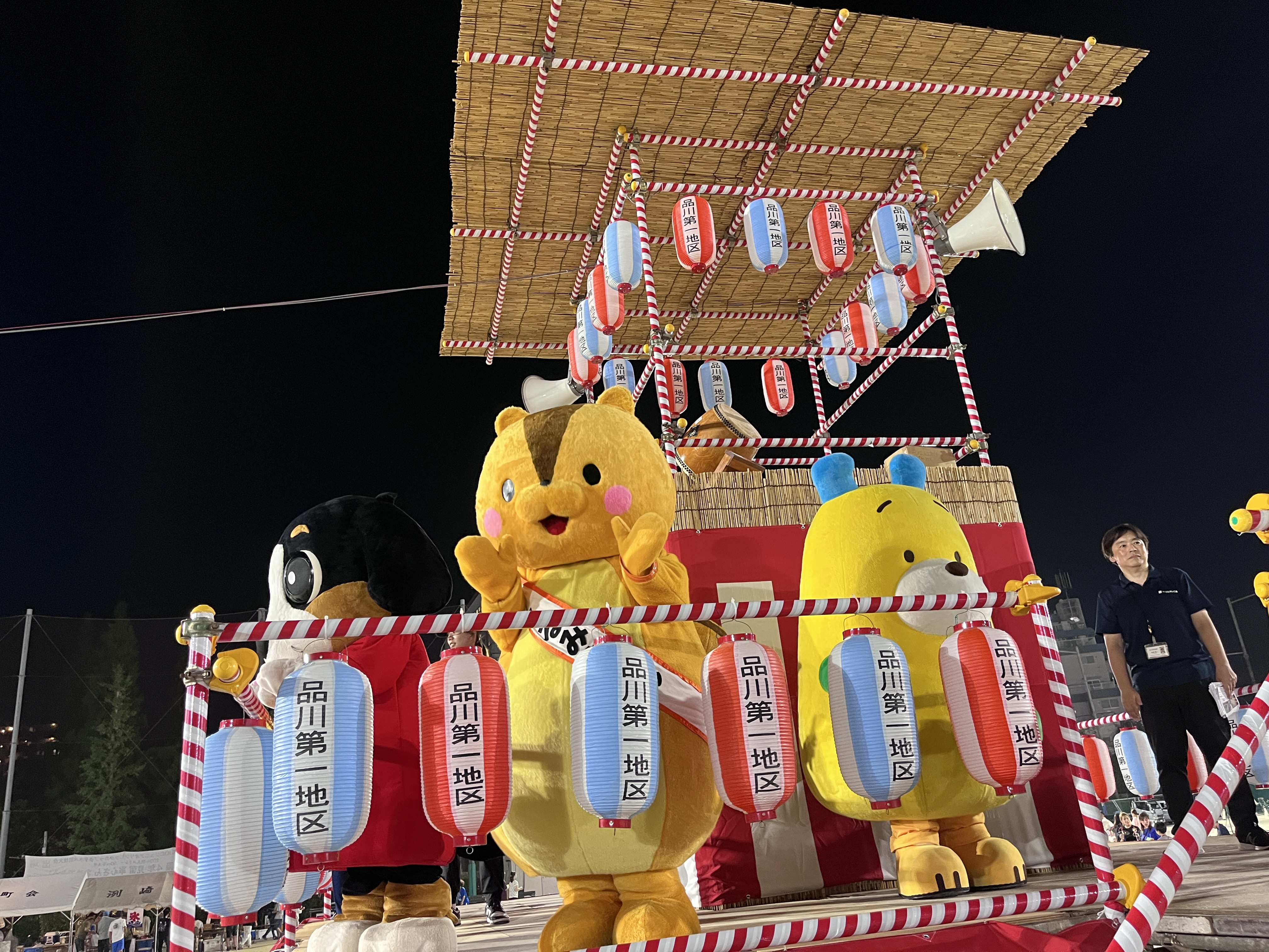 夕方になると、校庭(グラウンド)では毎年恒例の盆踊りが始まりました。子どもも大人も一緒になってやぐらを囲い、迫力のある太鼓の音色に合わせて「品川音頭」や「品川甚句」、「東京音頭」などの全9曲を踊りました。また、フィナーレに近づくと、防犯マスコットの「しなぼう」や認知症啓発キャラクターの「くるみちゃん」、ケーブルテレビ品川のキャラクター「シナガワン」も駆けつけ、一緒に盆踊りを盛り上げ、大盛況のまま品川第一地区まつりは幕を閉じました。