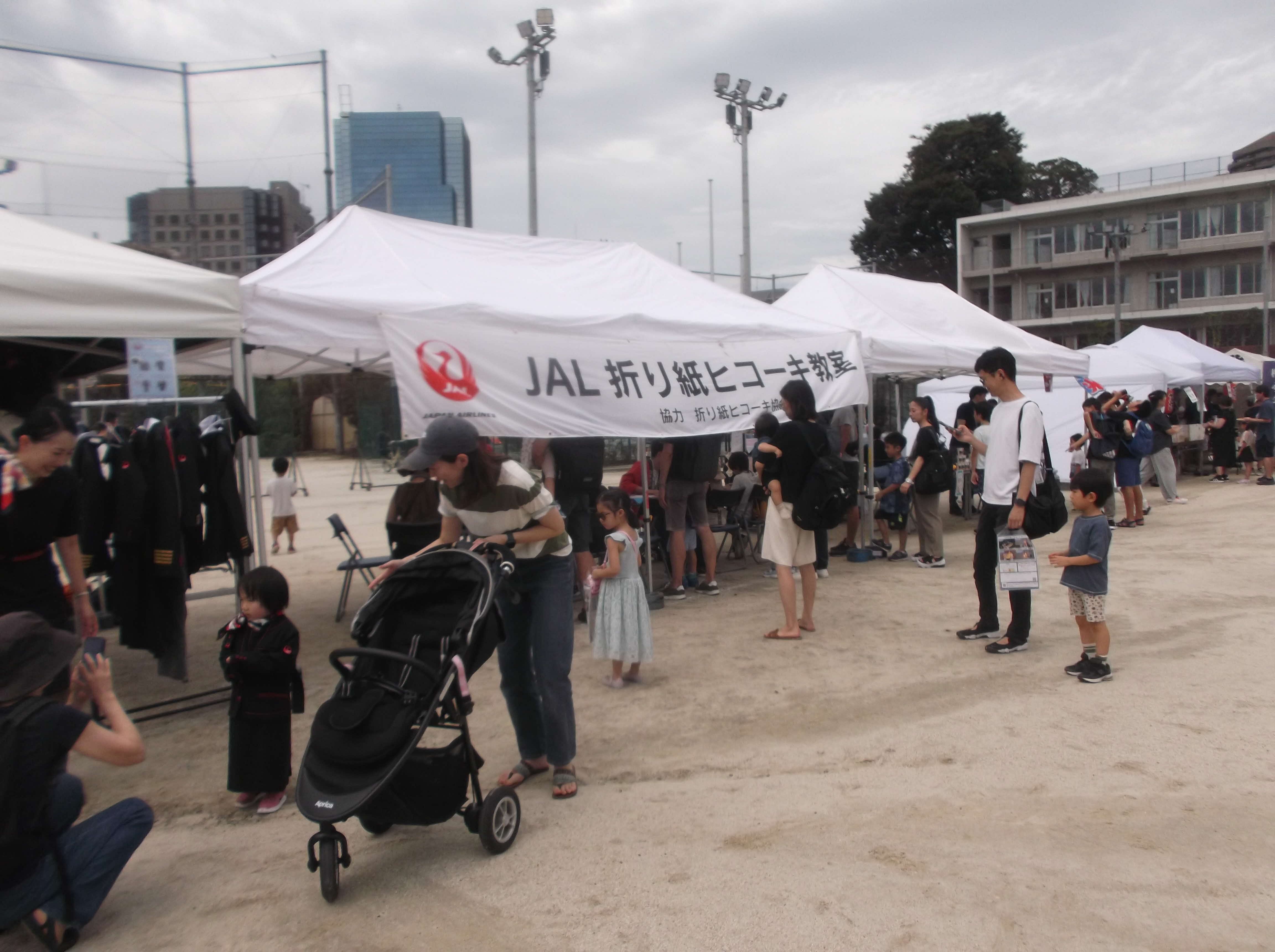 校庭(グラウンド)では、品川第一地区管内の町会・自治会をはじめ、健康づくり推進委員会や品川消防署、日本航空株式会社(JAL)などが並びました。かき氷や焼きそば、フランクフルトといった夏まつり定番の食べ物から射的や模擬金魚すくいといった子どもも楽しめるゲームコーナー、JALブースでは折り紙ヒコーキ教室など、さまざまなブースが並び、多くの来場者で賑わっていました。