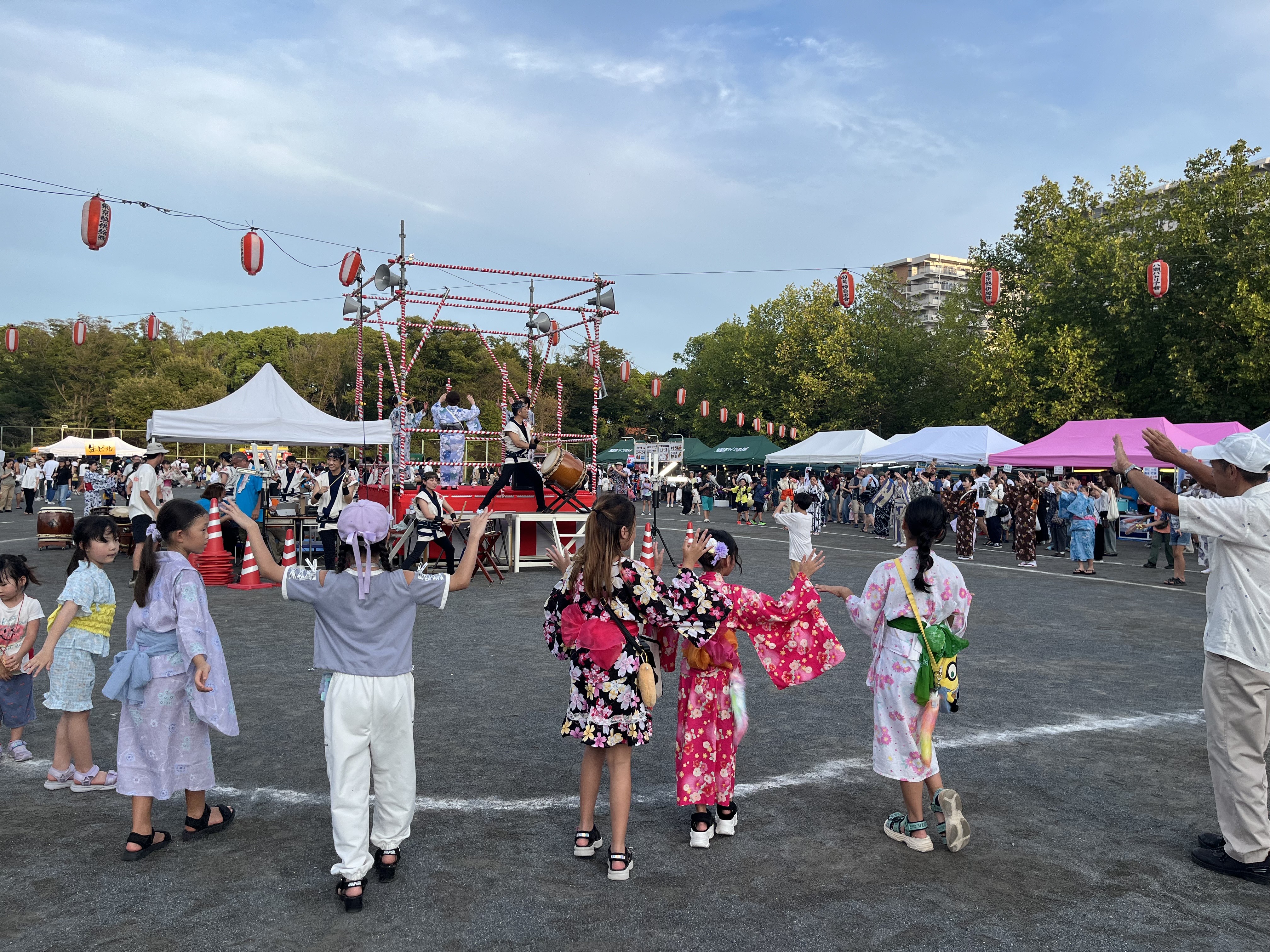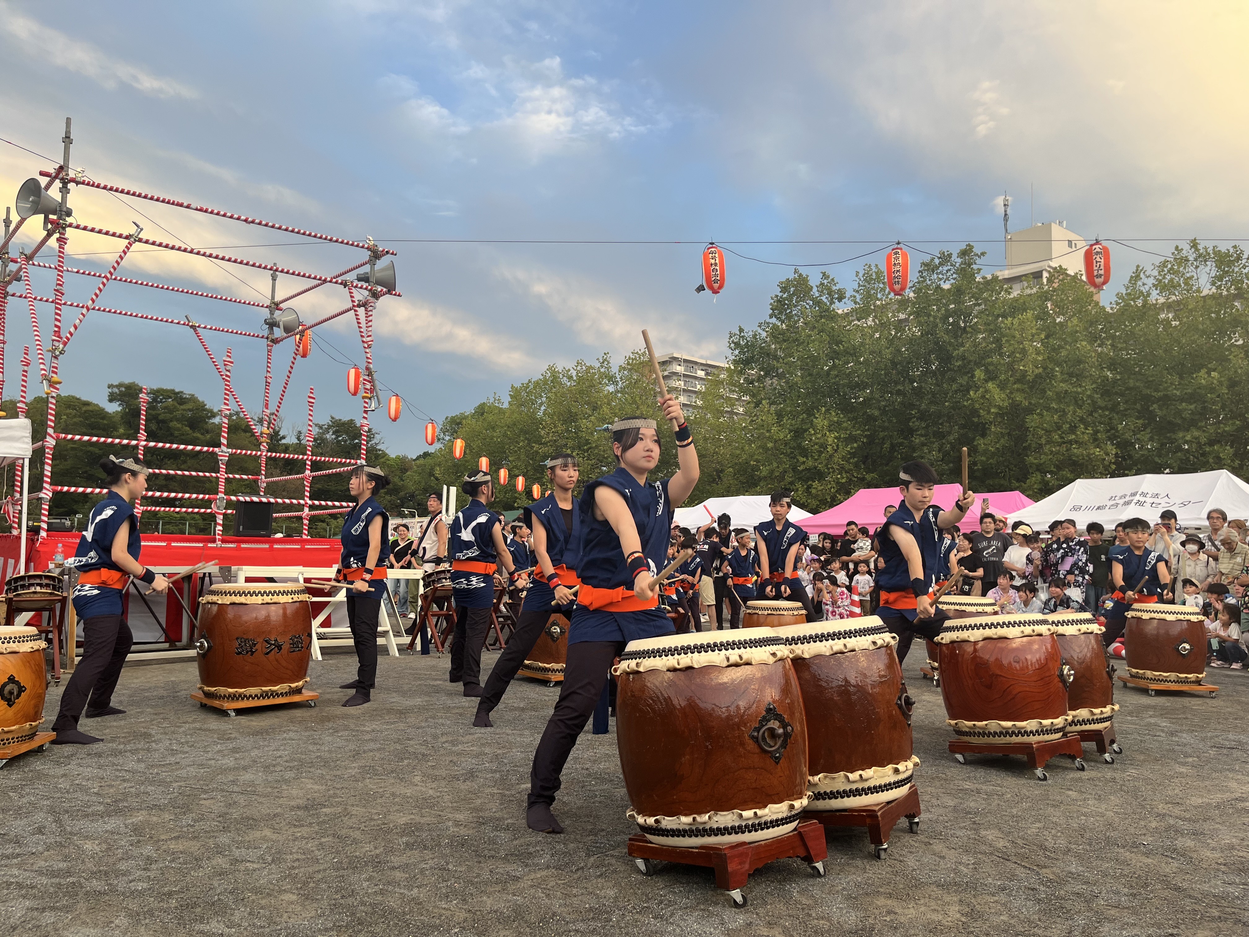 夜には会場中央のやぐらを中心として毎年恒例の盆踊りが行われ、大人から子どもまで大勢の方が参加し、華やかな浴衣姿で夏の夜を彩りました。また、八潮太鼓之会による演奏も行われ、力強い太鼓の音が会場に響き渡りました。