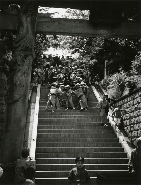 品川神社例大祭の宮出し。石段で神輿をおろしている。