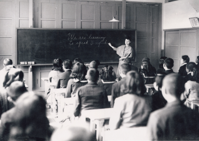 品川区立荏原第三中学校,英語の授業風景,ぶち抜き教室,黒板の後ろの扉がはずされると講堂になります