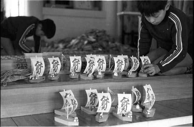 宝船 東海七福神 正月の縁起物 (品川神社にて) ID 327 撮影年月日 1965年(昭和40年)12月27日 撮影場所 北品川三丁目 内容 7カ所に参詣して、各所で七福神を揃える。起点の品川神社は大黒天。