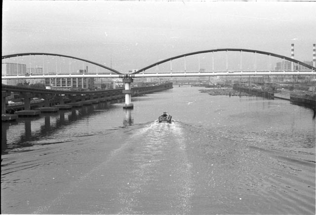 大井北ふ頭橋から北側を望む。東品川敬老会館への給湯管が見える